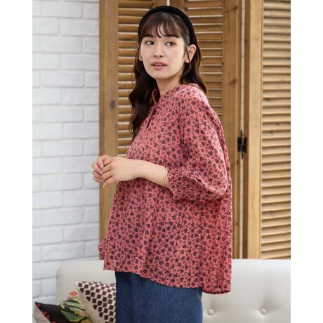 単色花柄が大人っぽい落ち着いたカラーリングのブラウスです。後ろにたっぷり取ったギャザーがシルエットに動きを出してくれます。デニム合わせがオススメです。