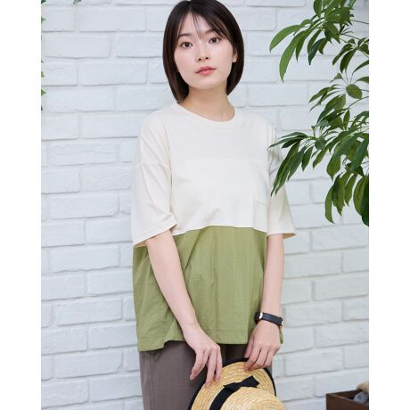 裾にワッシャー素材を切り替えたドロストデザインTシャツです。
