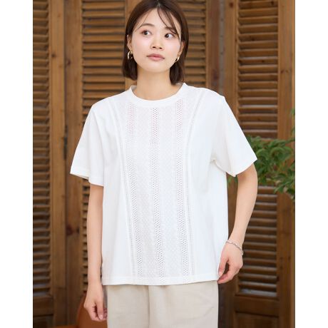 繊細なデザインの綿レースを正面に切り替えたTシャツです。オーガニックコットン100%なのでポリエステルの着心地が苦手な方にもおすすめです。裾の枠くま刺繍がアクセントです。