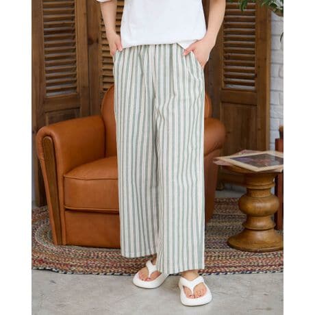 麻混の綿ポリエステルを使用したセミワイドパンツです。ウエスト部分は開き無しでゴムと内側に紐を通しています。サラッとした肌触りが特徴の夏らしい素材です。色は2色展開でベージュカラーはベージュの無地、カーキカラーはカーキベースの先染めストライプになります。