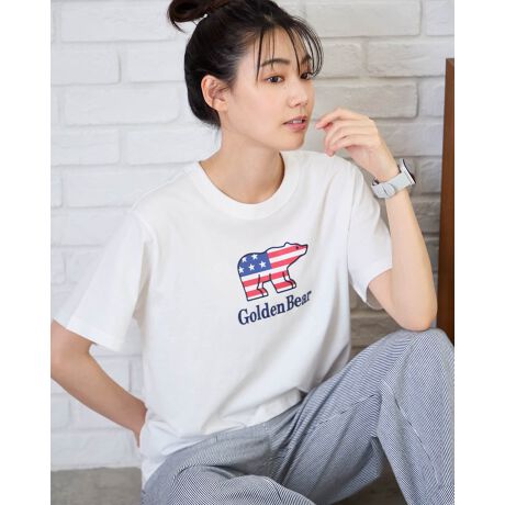 オーガニックコットン100%の星条旗デザインのGOLDEN BEARプリントTシャツです。ブランドロゴはフロッキープリントでアレンジしています。セットインスリーブですが、窮屈にならないシルエットで作りました。