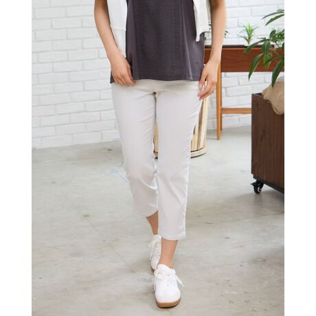 横ストレッチのレーヨン・ナイロン素材を使用したクロップドパンツです。ベーシックなテーパードシルエットで両脇裾にスリットが有ります。コードレーン(コード織り)と言う織りで表面に細いストライプ状の凹凸が有ります。先染めで2色の色を織り込み細かいストライプに仕上げました。ウエスト後ろのみ平ゴムを入れ伸びる仕様にしています。