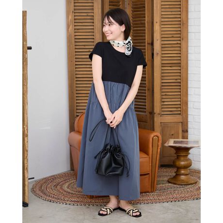 見た目にも爽やかで華やかなワンピース。身頃には表裏ともにキメが整いキレイ見えするスムースを使用。ムッチリと、ほどよい厚みがあり仕立て映えする点も魅力。ウエストから下はマットな質感が上品なポリエステルタフタのティアードスカートを接いでいます。透け感も無く素足での着用も可能。タイトな襟ぐりやフレンチスリーブが清楚でネックレスの他、日傘やカゴバックなど夏小物を添えた着こなしも素敵です。