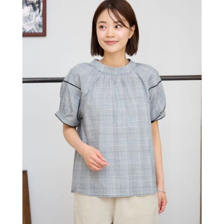 太い部分や細い部分、1本の糸の中に異なる表情を持ったスラブ糸を使用。構成の異なるチェック3柄の展開で柄違いで揃えるのもおすすめ。特にブラックベースのグレンチェックはきちんと感もありジュエリーを添えてオフィス使いも可能。少し高めな襟が肌露出を抑えてくれる上品なブラウスです。袖山線に向かって重ねたタックが膨らむ様子もフェミニンで華やかな1着。オーガニックコットンで環境にも配慮しています。