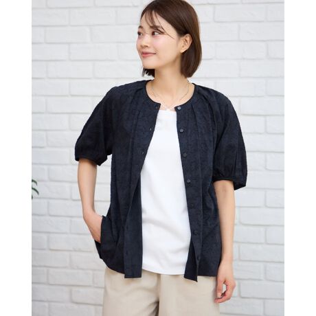 コットンの親しみやすさと、しなやかなレーヨンを使ったジャカードブラウス。葉や蔦が連続するようなサラサ風の柄を織りで表現しているため通常の生地よりも表情のある立体感が魅力です。タイトなネックラインが上品な前開きのブラウスはラグランスリーブと袖口のタックで丸みのあるシルエットに仕上げています。可愛らしさがあるのでボトムスはパンツがおすすめ。腕にブレスレットを添えて辛さをプラスしても素敵です。