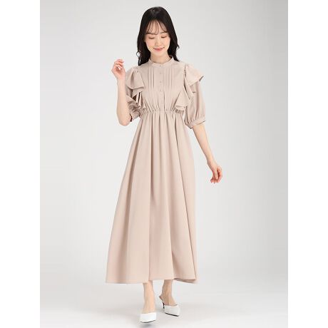 ドレープを描いたようにあしらわれたパイピングがワンポイントになったフリルワンピースです。やさしい色合いの花の総柄と五分袖のパフスリーブが、より一層上品で落ち着いた女性を演出してくれます。
