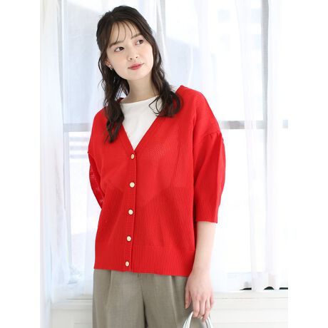 首元をすっきりと見せてくれるVネックに、ゴールドボタンが高級感をプラスするカーディガンです。ふんわりとした袖なので着心地もよく、二の腕をカバーしてくれるもの嬉しいポイント。メッシュなのでこれからのシーズンに活躍してくれます。