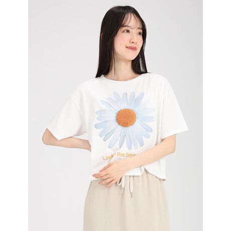 存在感がある大きなフラワープリントがアクセントになったTシャツです。クロップド丈なのでハイウエストのボトムスと合わせればスタイルアップ効果も期待できます。ジャケットやカーディガンからビッグフラワーを見せるスタイリングもおすすめ。