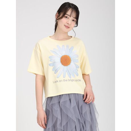 存在感がある大きなフラワープリントがアクセントになったTシャツです。クロップド丈なのでハイウエストのボトムスと合わせればスタイルアップ効果も期待できます。ジャケットやカーディガンからビッグフラワーを見せるスタイリングもおすすめ。