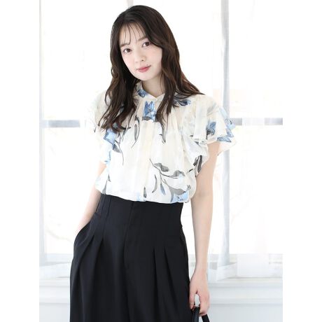 フレアに広がるフリルのスリーブと、淡いカラーで描かれた花柄が女性らしい印象を与えるプリントブラウスです。スタンドカラーがより一層清楚なイメージをもたらします。デイリーからお出かけまで、幅広いシーンで活躍してくれるひと品です。