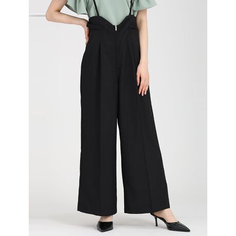 細いサスペンダーとV字にデザインされたウエスト部分が華奢なラインを作ってくれるパンツです。両脇のベルトでウエストの調整も可能。ファスナーがついていてストレスフリーな穿き心地も嬉しいポイントです。サスペンダーの紐は取り外し可能です。