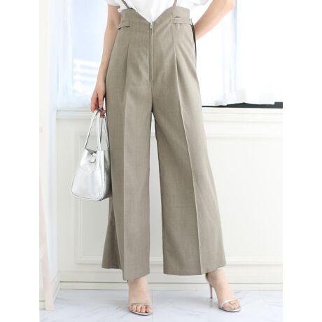 細いサスペンダーとV字にデザインされたウエスト部分が華奢なラインを作ってくれるパンツです。両脇のベルトでウエストの調整も可能。ファスナーがついていてストレスフリーな穿き心地も嬉しいポイントです。サスペンダーの紐は取り外し可能です。