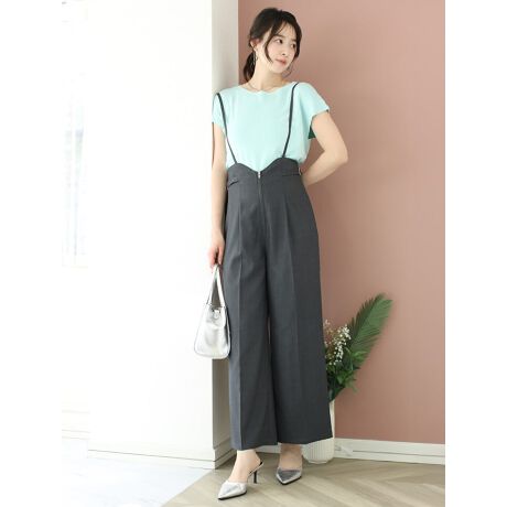 細いサスペンダーとV字にデザインされたウエスト部分が華奢なラインを作ってくれるパンツです。両脇のベルトでウエストの調整も可能。ファスナーがついていてストレスフリーな穿き心地も嬉しいポイントです。サスペンダーの紐は取り外し可能です。