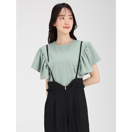 ギャザーでほどよくボリュームをフリルショルダーがフェミニンなペアスキン生地のブラウスです。すっきりとしたボディに、2枚に合わせたデザインが個性的なアイテム。パンツにもスカートにも合わせやすく、様々なスタイリングが楽しめます。