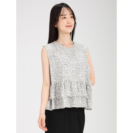 グリーン系の小花柄と、フリルを二段に重ねたティアードデザインが清楚な印象を演出するノースリーブブラウスです。デニムなどのカジュアルなボトムスとも合わせやすく、様々なスタイリングが楽しめます。