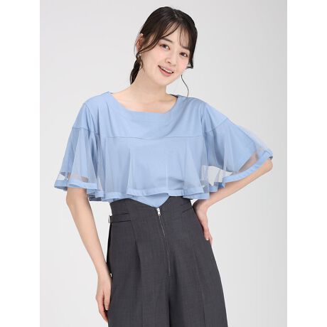 ボリュームのあるチュールケープが付いた華やかなプルオーバーです。シアーな生地がクールな印象を与えます。接触冷感素材を使用しているのでひんやりと涼しい着心地も嬉しいポイントです。