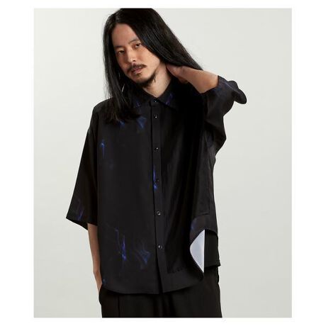 独創的なレイヤード構造が目を引く、ハーフスリーブレイヤードBIGシャツ。左前身頃のみに重ねられたシアー生地が、柄のニュアンスをぼかしながら浮かび上がらせ、唯一無二の存在感を放つ。柄はカラーごとに異なり、WHITEには水の揺らぎ、BLACKにはオーロラのような光の表現、CHECKには陰影の効いたチェックを採用。ワイドなオーバーサイズと短めの袖丈が、抜け感とモード感を同時に演出します。