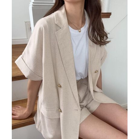 金釦ハーフスリーブリネン混シャツ+ショートパンツset(薄手、シャツ裏地なし)