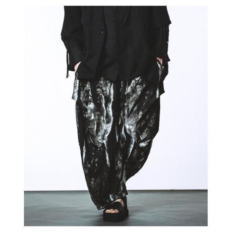 繊細な素材感とギャザーによる流れるようなドレープが、動きの中に美しさを宿すイージートラウザーズ。サイドタックと巧みに施された切り替えによって、立体的なシルエットを構築。生地をたっぷりと使用したワイドなフォルムが、モードな存在感とリラックス感を共存させる。ウエストはリブ仕様でストレスフリーな着用感を実現し、独創的なモノトーン柄がスタイルにアート性を添える。