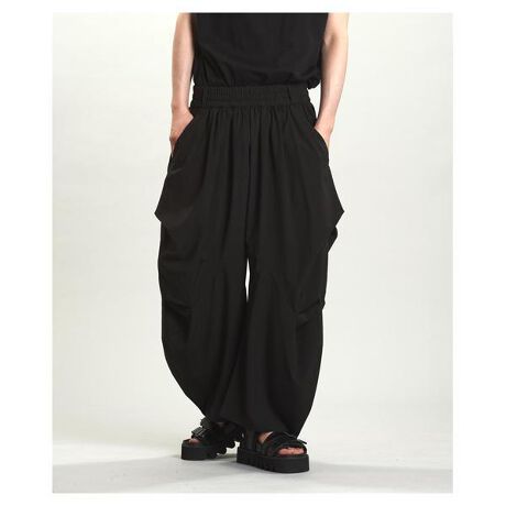 繊細な素材感とギャザーによる流れるようなドレープが、動きの中に美しさを宿すイージートラウザーズ。サイドタックと巧みに施された切り替えによって、立体的なシルエットを構築。生地をたっぷりと使用したワイドなフォルムが、モードな存在感とリラックス感を共存させる。ウエストはリブ仕様でストレスフリーな着用感を実現し、独創的なモノトーン柄がスタイルにアート性を添える。
