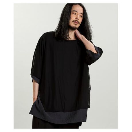 透け感のある極薄チュールと布帛素材を重ねた、異素材レイヤードのC/N BIG-Tシャツ。表地にはエアリーなシアーカットソーを、インナーにはドライタッチの布帛素材を採用し、軽やかさと構築的なシルエットを融合。内側に向かって斜めに入るディープスリットや、前後差を付けた着丈が奥行きを演出。袖もアシンメトリーなデザインでレイヤード感を際立たせる。背面のメローロック仕様やMIXカラーの配色もアクセントに。