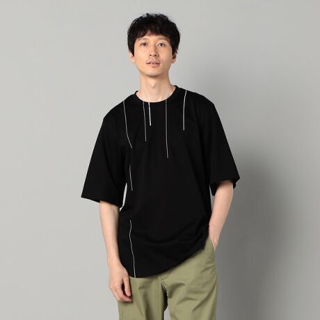 首元から、身頃にかけてアシンメトリーにラインをプリントしたデザインのTシャツです。