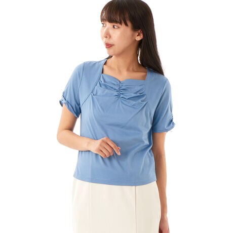 胸元ギャザーが可愛く、開きも控えめでジャケットインにもおすすめです。