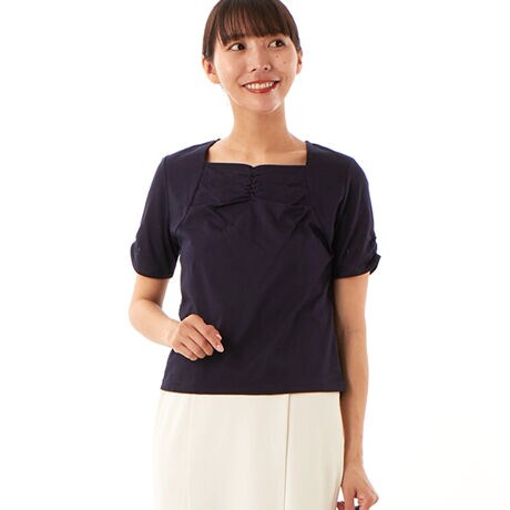 胸元ギャザーが可愛く、開きも控えめでジャケットインにもおすすめです。