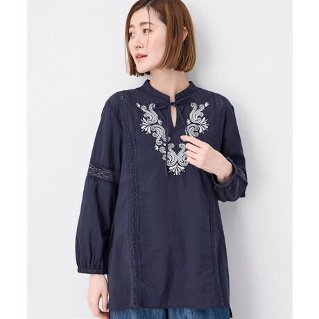 レースラインの切替とネックのリボンが甘さをプラスするチュニックブラウスです。