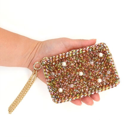 アンテプリマのアイコンとして大人気のワイヤーバッグと同素材のワイヤーを使用した お財布シリーズ。表面にパールやビーズを縫い付けることで、さらに華やかさを プラスしています。コンパクトに持ち歩けるフラグメントケースになります。背面側はレザーのカードポケットにしています。