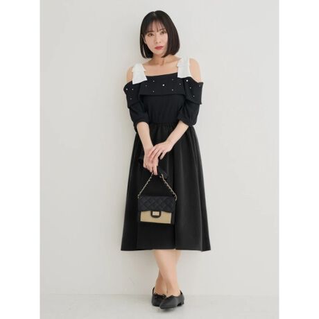 大きなショルダーリボンがフェミニンな印象のドッキングデザインのオフショルワンピース
