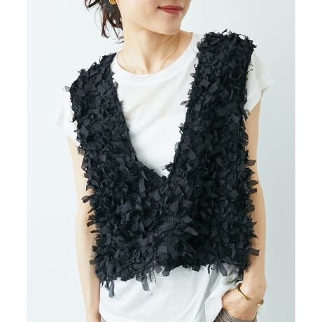 リボンでできたフリンジが目を引く、華やかなニットベスト。