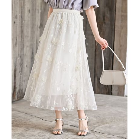 お花の刺繍に立体感のあるフラワーモチーフを重ねた贅沢スカート。