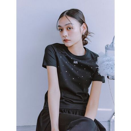 衿ぐり周りから裾に向かってグラデーションにホットフィックスをあしらったTシャツ。シンプルになりがちな夏のコーデにきらっと華やかな印象をプラスしてくれます。フロントのロゴ刺繍もポイント。透け感;なし