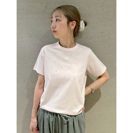 衿ぐり周りから裾に向かってグラデーションにホットフィックスをあしらったTシャツ。シンプルになりがちな夏のコーデにきらっと華やかな印象をプラスしてくれます。フロントのロゴ刺繍もポイント。透け感;なし