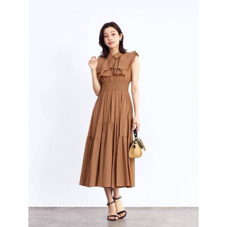 胸元にたっぷりとあしらったフリルが目を引く、華やかさと上品さを兼ね備えたワンピース。