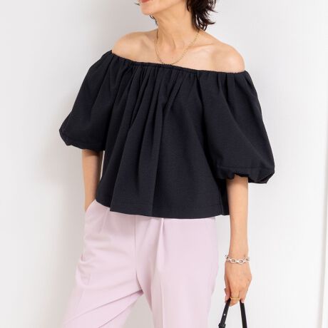 ・バルーン袖がモードなスクエアネックとオフショルのブラウス