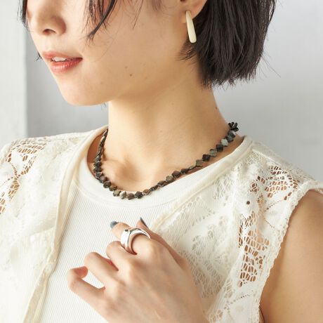 1つでも十分に存在感はありますが、お手持ちのネックレスとの重ね付けも◎