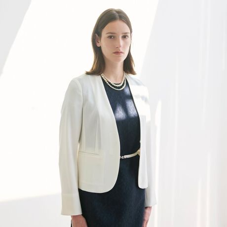 <上品なスタイリングをつくりだすノーカラージャケット>