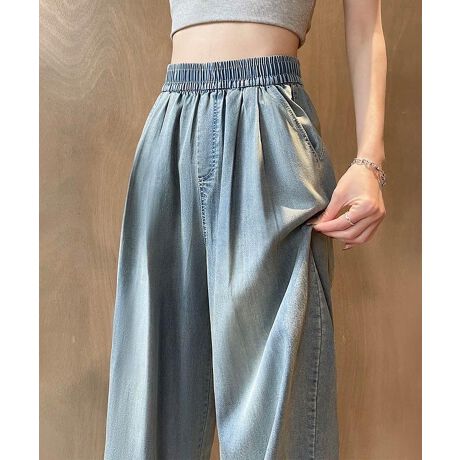 軽やかな落ち感とナチュラルな光沢が魅力のデニム調ワイドパンツ。ウエストはゴム仕様で、ストレスフリーな穿き心地と体型カバーを両立。