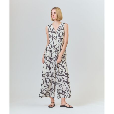 【Japan Fabric】 シーズナブルな装いを楽しめる、オリジナルで作成したプリントが一際目を惹くオールインワン。落ち感が綺麗で清涼感のある薄手のツイル地を使用し、汗ばむ季節でも一枚でさらっと着て頂けるデザインに仕上げました。ジレを連想させるスマートなVネックに前開きにボタンをトッピングして、マスキュリンなムード漂う大人なデザインに。ゆるっとしたワイドなリラックスシルエットですが、コンシャスにしたい時は脇に添えたリボンを後ろや前で結べば自然とメリハリの効いたシルエットをお楽しみいただけます。タウンユースでもリゾートシーンでも着回せる大人のオールインワン。この一つでコーディネートが完成する、夏の主力兼定番ワードローブです。