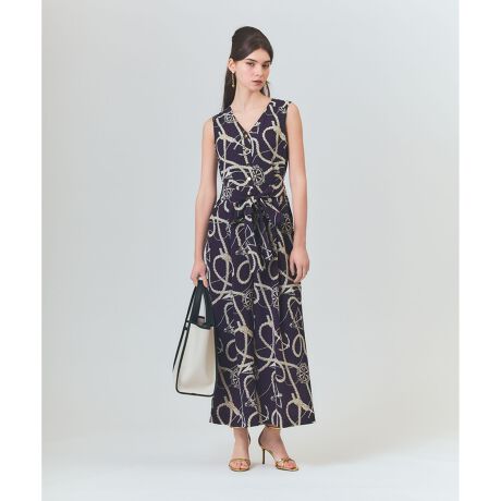 【Japan Fabric】 シーズナブルな装いを楽しめる、オリジナルで作成したプリントが一際目を惹くオールインワン。落ち感が綺麗で清涼感のある薄手のツイル地を使用し、汗ばむ季節でも一枚でさらっと着て頂けるデザインに仕上げました。ジレを連想させるスマートなVネックに前開きにボタンをトッピングして、マスキュリンなムード漂う大人なデザインに。ゆるっとしたワイドなリラックスシルエットですが、コンシャスにしたい時は脇に添えたリボンを後ろや前で結べば自然とメリハリの効いたシルエットをお楽しみいただけます。タウンユースでもリゾートシーンでも着回せる大人のオールインワン。この一つでコーディネートが完成する、夏の主力兼定番ワードローブです。