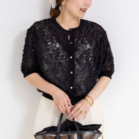 細かいシフォンが重なっているシースルーのカーディガンでとても素敵です。着た感じはふんわりしていてかわいいので、パンツスタイルだとカジュアルダウンできて日常でも使いやすそうです。オンオフ使えそうで、セールやポイントでお得に購入できて良かったです。