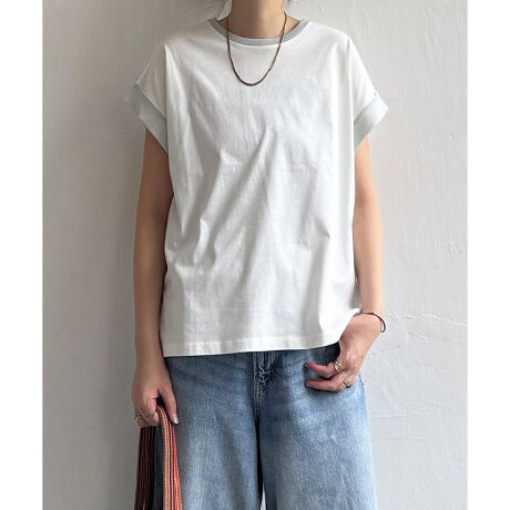 ネックと袖のラメの配色切り替えが魅力のフレンチスリーブTシャツ。