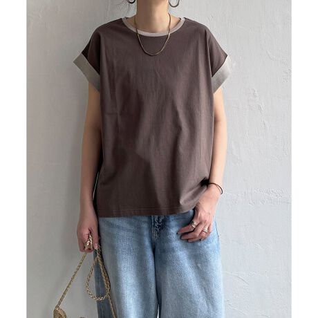 ネックと袖のラメの配色切り替えが魅力のフレンチスリーブTシャツ。