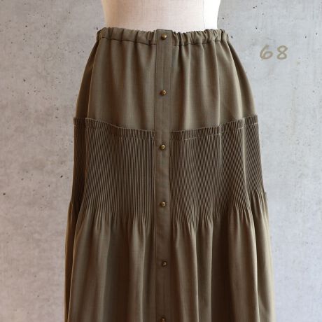 途中で消えていくプリーツですっきり見せてくれるボリュームスカートです。