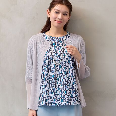 メッシュ素材に細かいプリーツ加工を施したカーディガン。