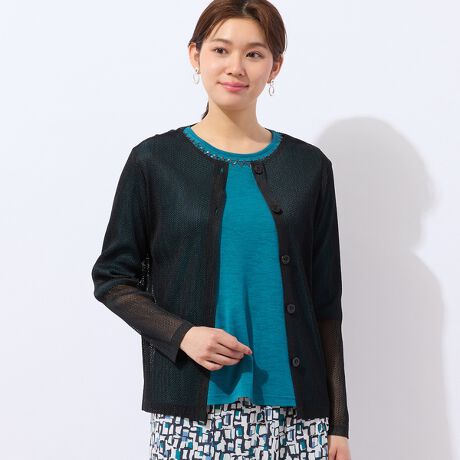 メッシュ素材に細かいプリーツ加工を施したカーディガン。