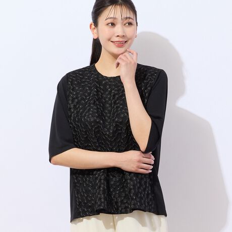 前身に小花柄の刺繍生地を組み合わせたTシャツです。
