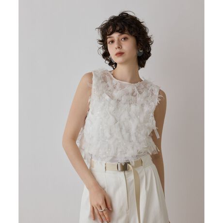 今季注目のフリンジテクニックが一際目を惹くショートベスト。 チュールとスパンコールヤーンを様々な形で叩きつけ、最後にふらしで終わらせる事でフリンジを表現しました。動いた時のフリンジの表情やスパンコールの輝きが目を引く、Diagramならではのテクニックが光る一着です。 ベスト感覚で着用できるよう、あえてアームホールを大きく開けたデザイン。前後どちらでも着用でき、スタイリングや好みに合わせて V 開きと襟ぐりの詰まった開きのどちらもお楽しみいただけます。カジュアルなデニムパンツに合わせたり、とろみのあるワイドパンツでリラックスムードをプラスした大人な装いもおすすめです。